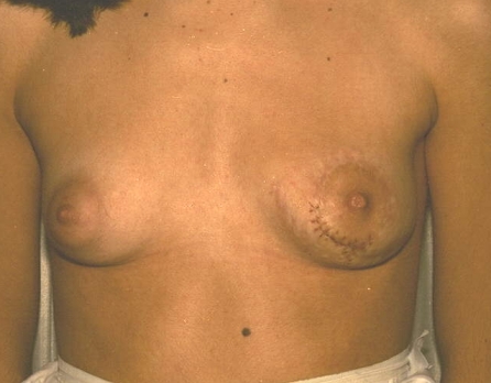 Anche la mastoplastica ricostruttiva dopo mastectomia per tumore presenta talora aspetti interessanti. In questo caso il problema non era dover ripristinare con un adeguato impianto protesico un volume mancante dopo la quadrantectomia (ho impiantato una protesi da 200 cc); il problema era dover ricostruire totalmente il complesso areola-capezzolo precedentemente sacrificato dall'intervento demolitivo. In questo caso l'areola controlaterale aveva abbastanza "stoffa" da consentirmi di trapiantare una piccola striscia di settore circolare che ho utilizzato come innesto di Wolfe-Krause per la ricostruzione dell'areola mancante. Il capezzolo è stato da me ricostruito decapitando quello controlaterale e trapiantando il pezzo nella sede dovuta.